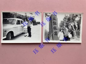 【无锡旅游好风光,标价和发货只有第一张图的上边那一张,下边那张仅供参考】尺寸看图,老照片,应该是拍摄于太湖饭店(附近),美女合影,裙子,两个人站在一辆老式汽车旁的场景。女士穿着短袖上衣搭配花纹裙,脚踩简约鞋子;男士身着条纹短袖衫,搭配长裤,斜挎白色挎包,尽显当时的流行风格。老式汽车外观经典,车身线条简洁,具有那个年代汽车的典型特征。相纸厚,品相好