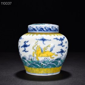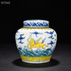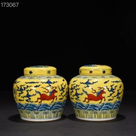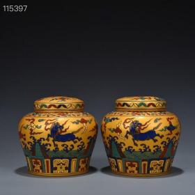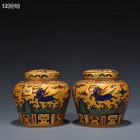 明成化黄地斗彩天马纹天字罐13*14厘米