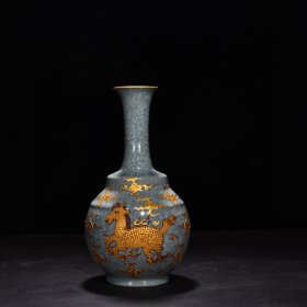 瓷器 宋汝窑天青釉沥粉描金天马纹长颈瓶2(大宋汝窑青龍寺御制款) 高29厘米宽15厘米
