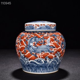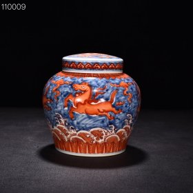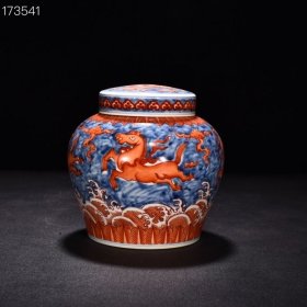 明成化青花矾红天马纹盖罐 高15厘米 宽12.5厘米