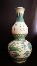 元青花的鼻祖,大宋明道元年造青花天马纹巨型葫芦瓶,高46X宽20Cm。器型优美俊秀,做工精湛细腻。青花发色灰蓝,包浆润泽如玉,色泽斑驳沉稳,土沁特征明显。行草书诗经名句:呦呦鹿鸣,食野之苹……字体洒脱流畅,配以宋代典型的天马(小头矮马),芭蕉叶及祥云纹。整体寓意吉祥,体现了宋代重文轻武和尚古之风。 此瓶无论文物价值和艺术价值都是不可估量的,填补了我国宋代青花瓷器的空白……