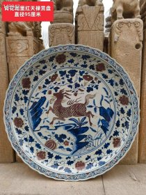 271_青花釉里红天禄赏盘 直径达95厘米 盘身绘以灵动天禄神兽,辅以缠枝莲枝叶与釉里红花朵,边缘纹饰精美,于古朴石雕间尽显古韵,集工艺与美感于一身,尽显传统瓷器魅力 。