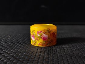檀木盒藏乾隆年制老料器粉彩福寿纹扳指,圈口2.3厘米、直径3.4厘米。古朴檀盒,开启见黄润扳指,绘粉彩福寿纹,集工艺与古韵于一身,是可赏可藏的文玩佳物,承载岁月韵味,尽显往昔精致 。
