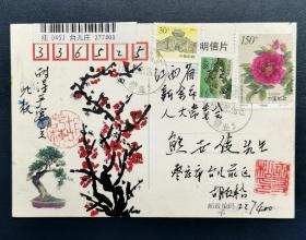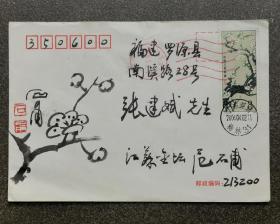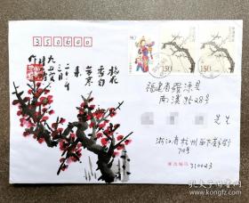 福建签藏名家张建斌旧藏:已故著名画家、“一代梅师”陆九畴手绘梅花封,贴1998-15(3-3)等邮票3枚,2006年3月27日杭州留园实寄福建罗源。