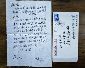 (羊村旧藏)韩天衡评价其篆刻甚高的、原南京艺术学院党支部书记、美术系主任、江苏书画家协会副主席、精于书法篆刻的丁吉甫(又名丁守谦)致羊村毛笔信札一页,带封。有邮票 钤章。