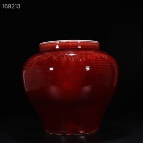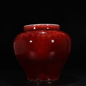 元祭红釉雕刻龙纹罐 32*32厘米