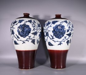 旧藏 元祭红釉留白雕刻青花缠枝牡丹纹梅瓶一对 高45×26厘米