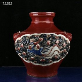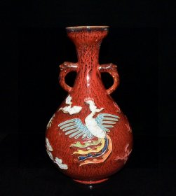 旧藏 元代红釉五彩雕刻龙凤纹双耳瓶【33.7x20.5cm】