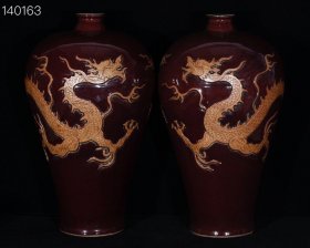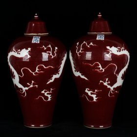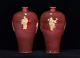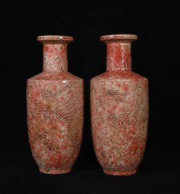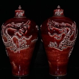 旧藏 元代霁红釉留白雕刻龙纹梅瓶一对【 33x19.5cm 】