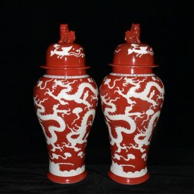 元红釉留白雕刻五龙纹大将军罐一对【106x44cm】