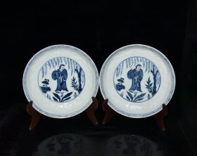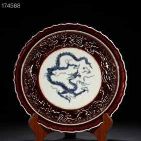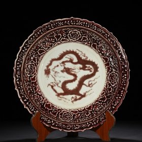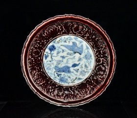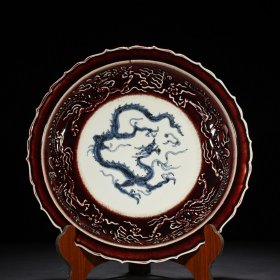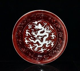 瓷器 元代霁红釉青花人物故事纹雕刻龙纹盘【6×32.3cm】