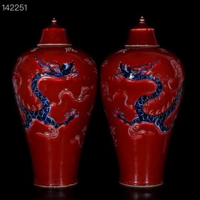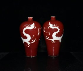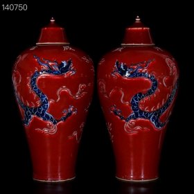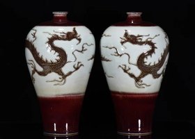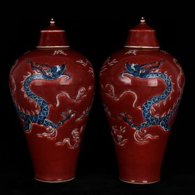 元祭红釉青花釉里红雕刻龙纹梅瓶一对