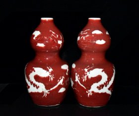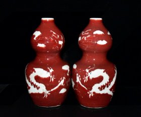 瓷器 元代霁红釉留白雕刻龙纹葫芦瓶一对【33.8x18cm】