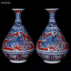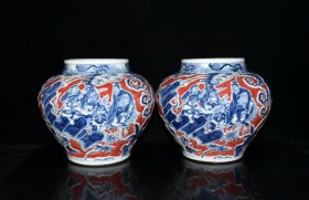 瓷器 元代红釉青花雕刻唐太宗人物故事纹罐一对【20.7×24cm】