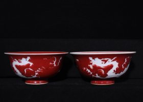 瓷器 元祭红釉雕刻云龙纹碗 高10厘米 宽20厘米