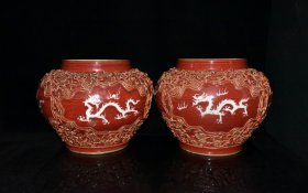 元代红釉捏花留白雕刻龙凤纹罐一对