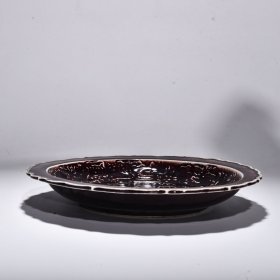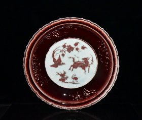 旧藏 元代霁红釉雕刻麒麟凤纹盘【 7x43cm 】