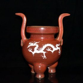 瓷器 元代红釉留白雕刻龙凤纹香炉【29x24.8cm】