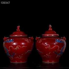 旧藏 元代红釉捏花留白雕刻龙凤纹罐一对【 27.2x37cm 】