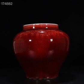 元祭红釉雕刻龙纹罐 厘米32*32 1