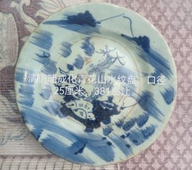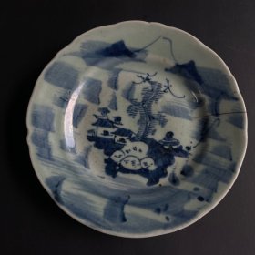 清代山水人物盘,豆青青花盘。山水人物盘,一冲、一磕碰。其它地方是烧时候釉子收缩,娘胎自带的。成化年制寄托款。