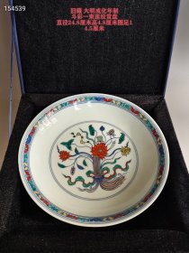 旧藏大明成化年制款斗彩一束莲纹赏盘,径24.8厘米、高4.8厘米、圈足14.5厘米,胎釉细润如脂,釉面泛着成化瓷特有的柔美白光。盘心斗彩绘一束莲纹,红荷艳妍、黄荷明丽,莲茎缠束、翠叶舒展,衬以莲蓬小果,青花勾线纤巧,彩料敷色淡雅清丽,尽显成化官窑“秀雅玲珑”的风骨。一束莲寓“清廉和睦”,盘沿彩纹呼应中心,层次婉约。入匣珍存,一器藏尽明瓷的隽秀与雅韵,是文玩中的稀雅之品。