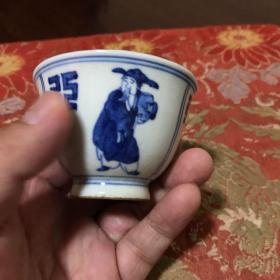 H-0668日本回流 【尤珍系列】明清陶瓷 细路 青花仙人主人杯 底款:大明成化年制(V字线、3颗锯钉)满杯容量:100毫升