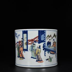 清代康熙青花五彩琴棋书画人物诗词笔筒成化年制寄托款
