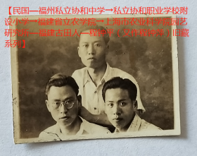 民国老照片:民国永安—福建省立农学院。三位同学。【民国—福州私立协和中学→私立协和职业学校附设小学→福建省立农学院→上海市农业科学院园艺研究所—福建古田人—程钟平(又作程钟萍)旧藏系列】——校简史:民国29年创办于永安县。抗战胜利后迁福州市。51年6月并入厦门大学,改为厦门大学农学院,校址设在福州市。52年与福州大学农学院合并更名福建农学院,校址协和大学原址。