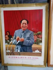 大型毛主席像山河人物,背文敬祝毛主席万寿无疆,伟大领袖毛主席巨幅画作落成纪念,1968,10,1,中国人民解放军湖北省公安机关军管会新生玻璃厂军管小组敬制。〈此章稀见,)