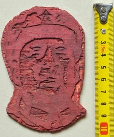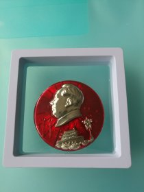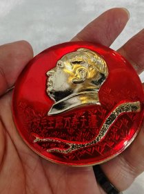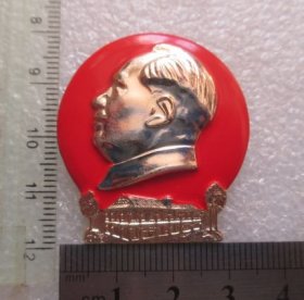 毛主席像章,毛主席七十六寿辰像章,正面红底金色浮雕头像、松枝,敬祝毛主席万寿无疆,背面毛主席七十六寿辰,1969.12.26.内纪厂革委会敬制,尺寸详见图片(C47)