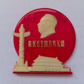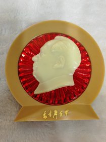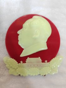 毛主席夜光摆件(天安门,五朵葵花)红底夜光毛主席立体头像,夜光天安门,夜光五朵葵花,背面有支架,“敬祝毛主席万寿无疆”中国上海工农厂敬制;尺寸:12cm 12.2cm(BJ15)