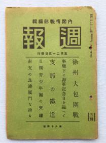 侵华资料:《周报》第八十四号,话说厦门港,支那的铁道,徐州大包围战(内有台儿庄附近战况要图,徐州附近要图,山西京汉线方面要图)等等,内有多幅图片