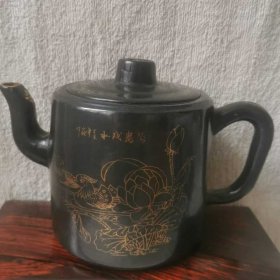 185_旧藏:乡下偶的名家纯手工制作紫砂挂釉描金画彩鸳鸯戏水老紫砂壶一把,保存完整,画工精细细致,包浆浓厚十足,皮壳一流完美,三点一线,通水流畅,收藏陈设使用极品。