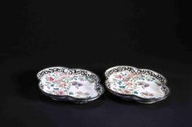 清 铜胎画珐琅彩鸳鸯葵口茶托一对
