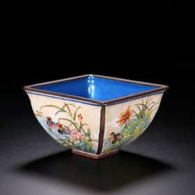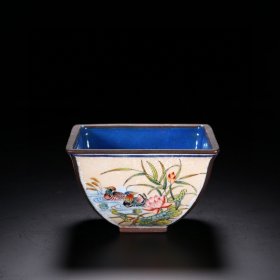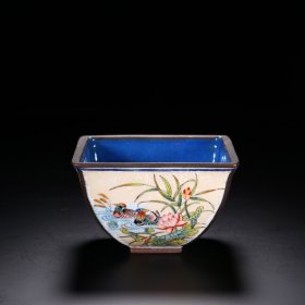 清代 铜胎画珐琅鸳鸯莲池倭雕方碗