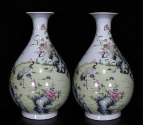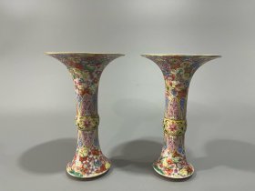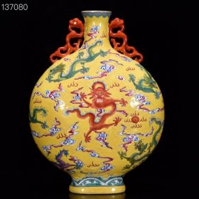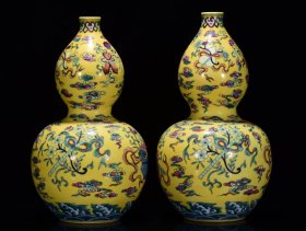 清雍正年制粉彩八宝纹葫芦瓶,高37厘米、宽21厘米。 黄地粉彩绘制精美,八宝纹饰清晰,祥云纹样环绕,工艺精湛。底部有"大清雍正年制"款识,胎质细腻,釉色均匀。 品相完好,