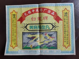 (老药标)无锡中药厂(原无锡中成药厂广告)出品的“白龙牌”黄病补血丸的包装标签。该药品用于因钩虫寄生引起的贫血症,如脱力、黄桑叶、黄粪怪毒等,具有补血功效。