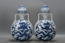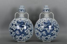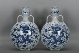 明宣德青花缠枝莲龙纹抱月瓶一对尺寸高30厘米口径4厘米厚度13.5厘米底经20.2厘米底经7厘米