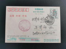 实寄封:甘肃-天津 贺年(有奖)明信片中国民间艺术 剪纸 1枚 甘肃兰州 贺年有奖明信片发行纪念戳1枚