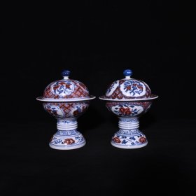 明,宣德祭红瓜菱碗一对高8.5厘米,口径19厘米,底径8.5厘米。