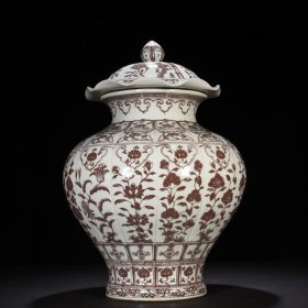 明洪武釉里红瓜楞十二花卉纹荷叶盖罐