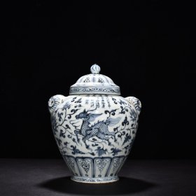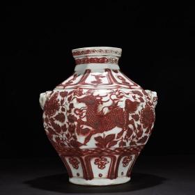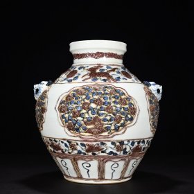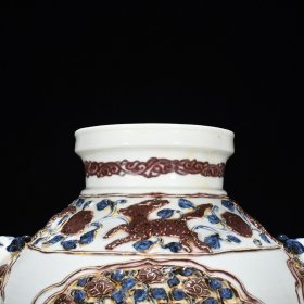 明洪武青花釉里红满工手绘麒麟串花兽首堆塑耳罐