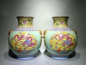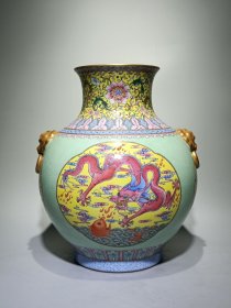 清乾隆款珐琅彩“龙凤麒麟狮”黄地描丝白兽耳瓶