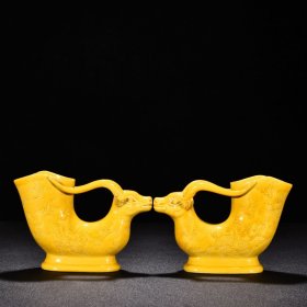 明弘治娇黄釉刻麒麟纹兽首黄羊杯10x15厘米