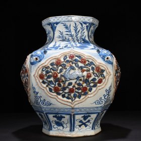元青花釉里红贴塑花卉麒麟凤纹八方兽耳罐40*34厘米