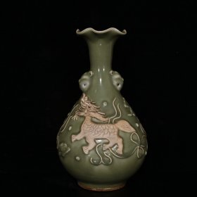 明代龙泉雕刻麒麟纹兽头花口玉壶春瓶(36×21cm)