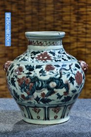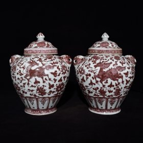 W大明洪武釉里红麒麟纹兽耳盖罐,高30x26厘米