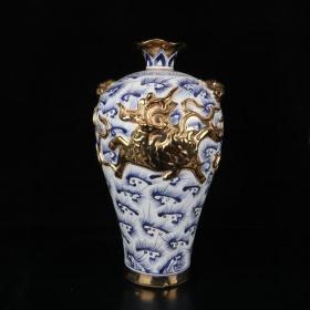 浮雕青花鎏金麒麟纹兽耳花口梅瓶 高36cm宽19cm