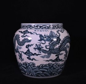 青花海水龙纹缸,高21×23厘米1